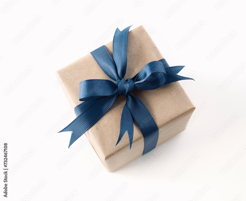 Gift box, present wrap with blue ribbon and bow top view on white background.