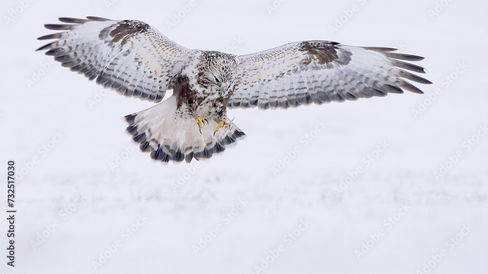Rough-legged buzzard or hawk bird in flight over snowy field in winter Buteo lagopus