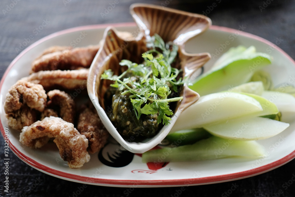 Pork rind, Pork scratchings, Pork crackling with Nam Prik Num or northern Thaig Green chilli dip on white plate and herbal vegetables. Thailand food