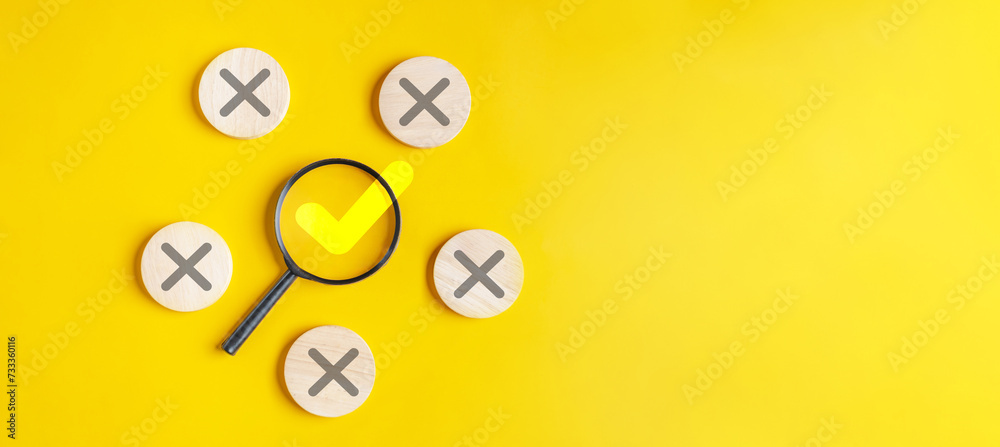 approval, approved, check, checkmark, choice, choose, confirm, correct, cross, decision. holding magnifying glass looking for right or wrong marks on wooden dice, the concept of choice without people.