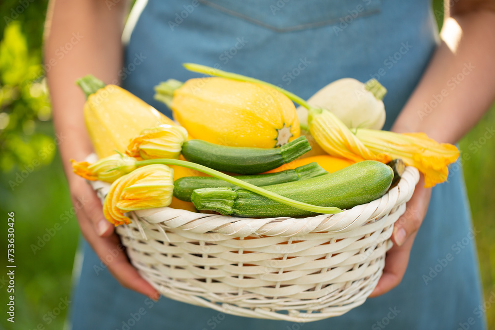 Woman holds a basket full of young zucchini with flowers. Selective focus, close-up.