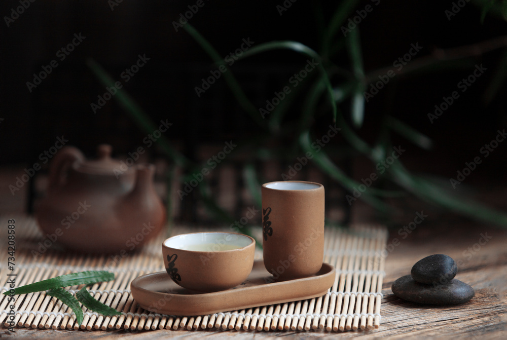 Traditional green tea ceremony set - white teapot and cups with stones piramide, house for the soul, on the tray