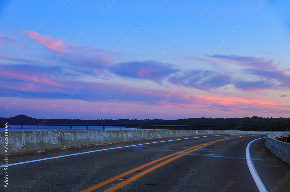 A beautiful sunset/sky over Norfork Lake from the 101 Bridge with the 62 Bridge in the background In Mountain Home, Arkansas