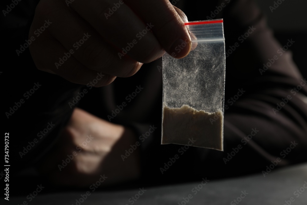 Drug addiction. Man with plastic bag of cocaine at grey table, selective focus