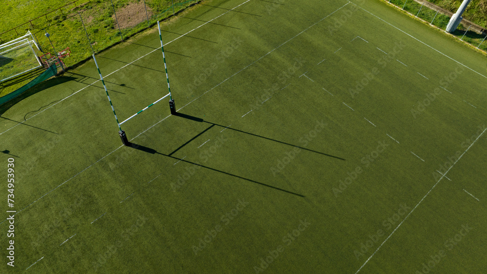 Aerial view of rugby goal post in a stadium on a sunny day. It is an artificial turf rugby field. The sports facility is empty.