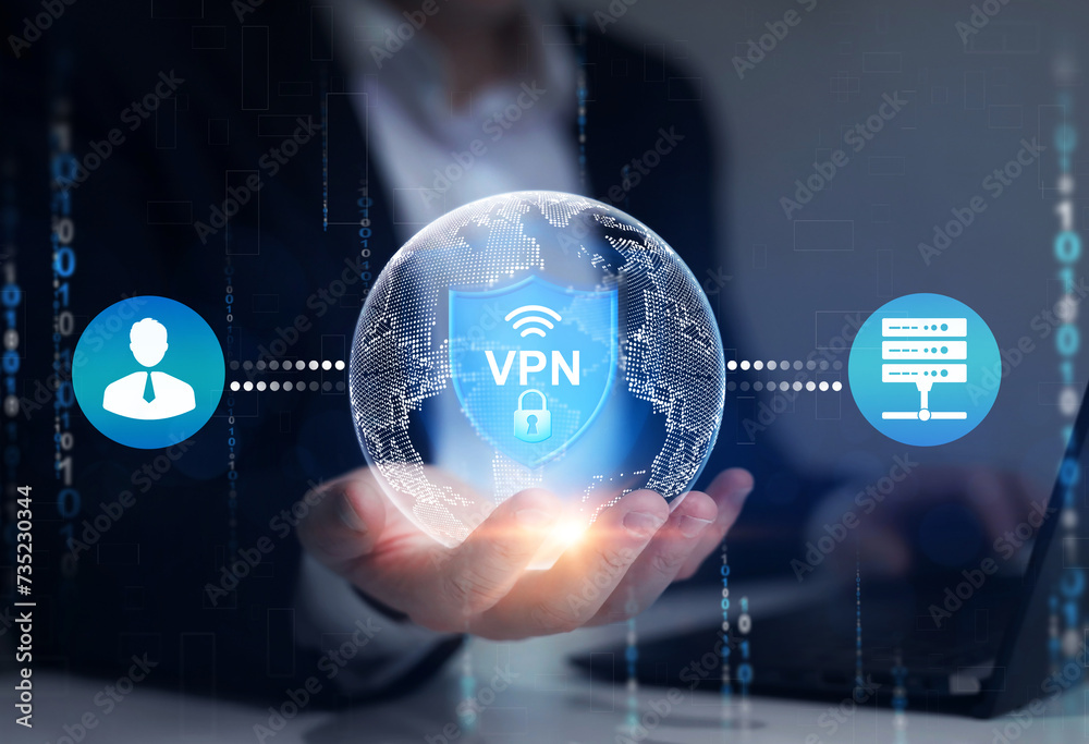 Remote server with private internet network technology to protect privacy of personal data. VPN secure connection.