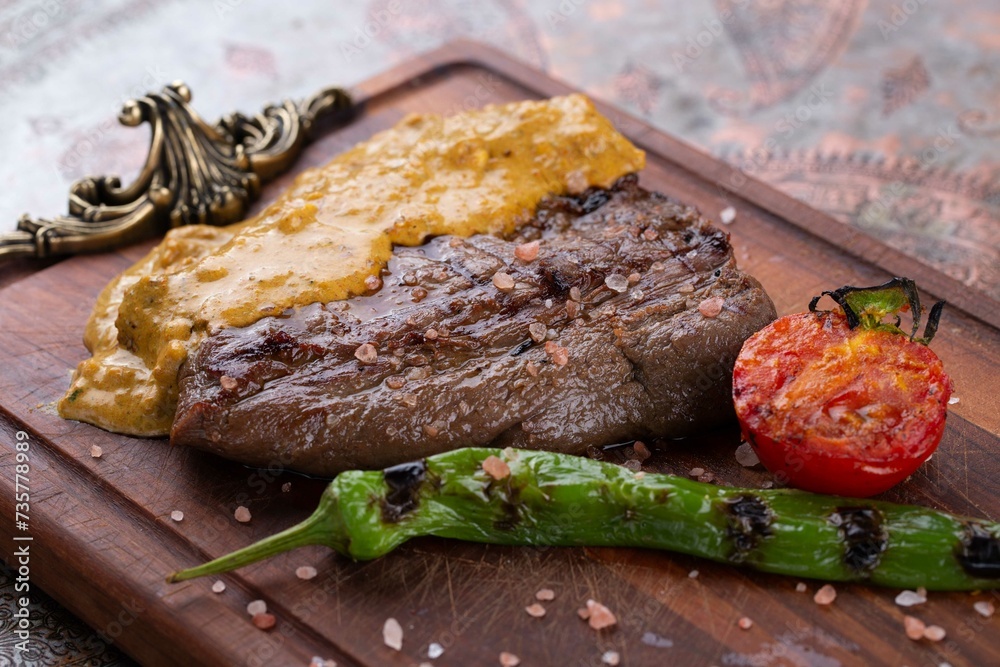 Fresh cooked medium rare steak served with pepper and tomatoes on wooden board at restaurant, healthy protein dinner