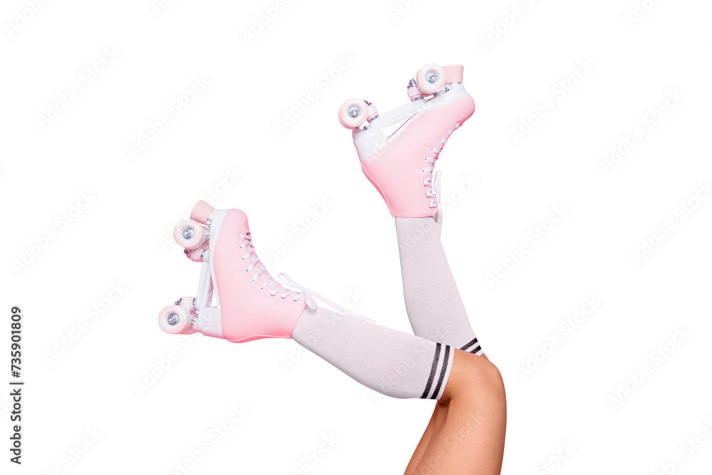 Close up photo of woman's body part. Legs wearing cute sweet with shoelaces four wheeled roller blades isolated tanned bright vivid background