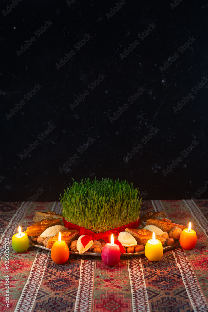 Beautiful Novruz tray on rug with semeni - wheat grass, pakhlava, shekerbura and festive candles on national Azerbaijani carpet table cloth. Spring equinox and new year celebration in Baku.