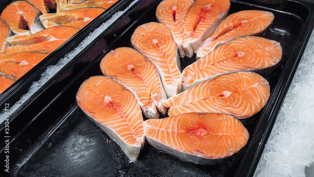 Large group of red and purple tulips and white daffodils blooming in spring with big shrubs of flowering syringas on a background in Herttoniemi manor park in Helsinki
