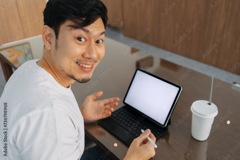 Happy asian man smiling look at camera, hand presenting white blank screen of laptop, got some idea, great choice, working and sitting in cafe.