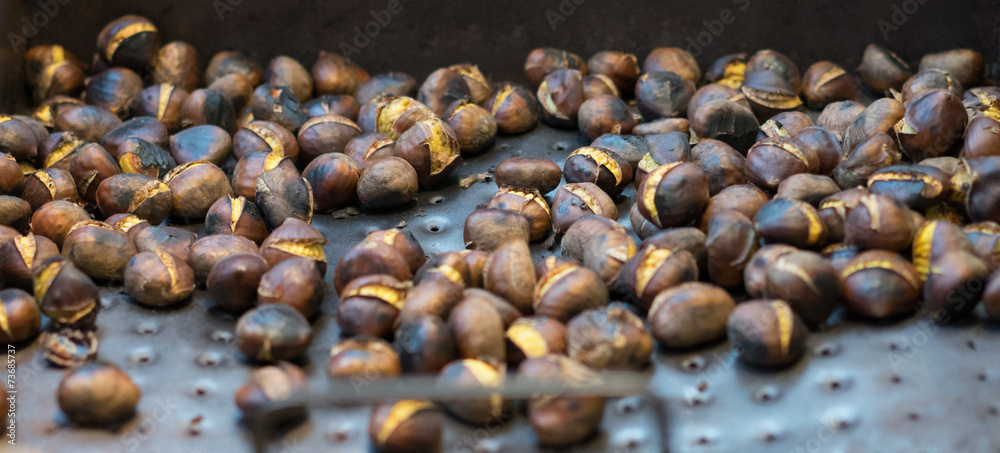 Roasted chestnuts cooling on a tray
