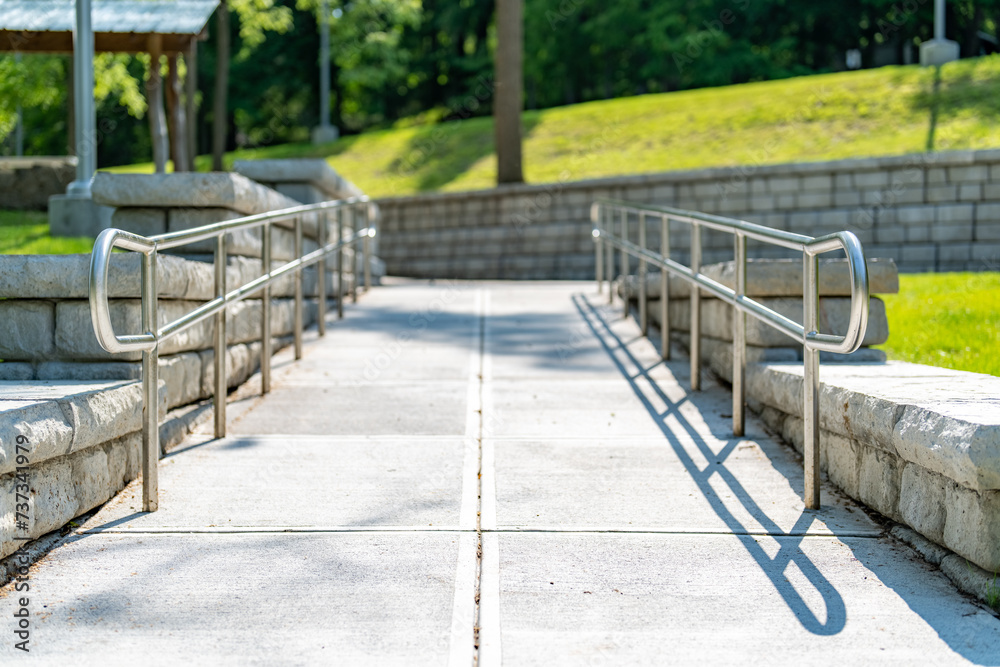 Outdoor, exterior gray concrete ramped sidewalk with stainless steel railings.