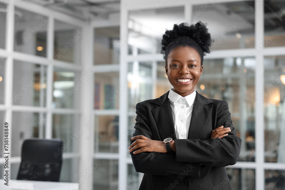 Happy woman with crossed arms in office, space for text. Lawyer, businesswoman, accountant or manager