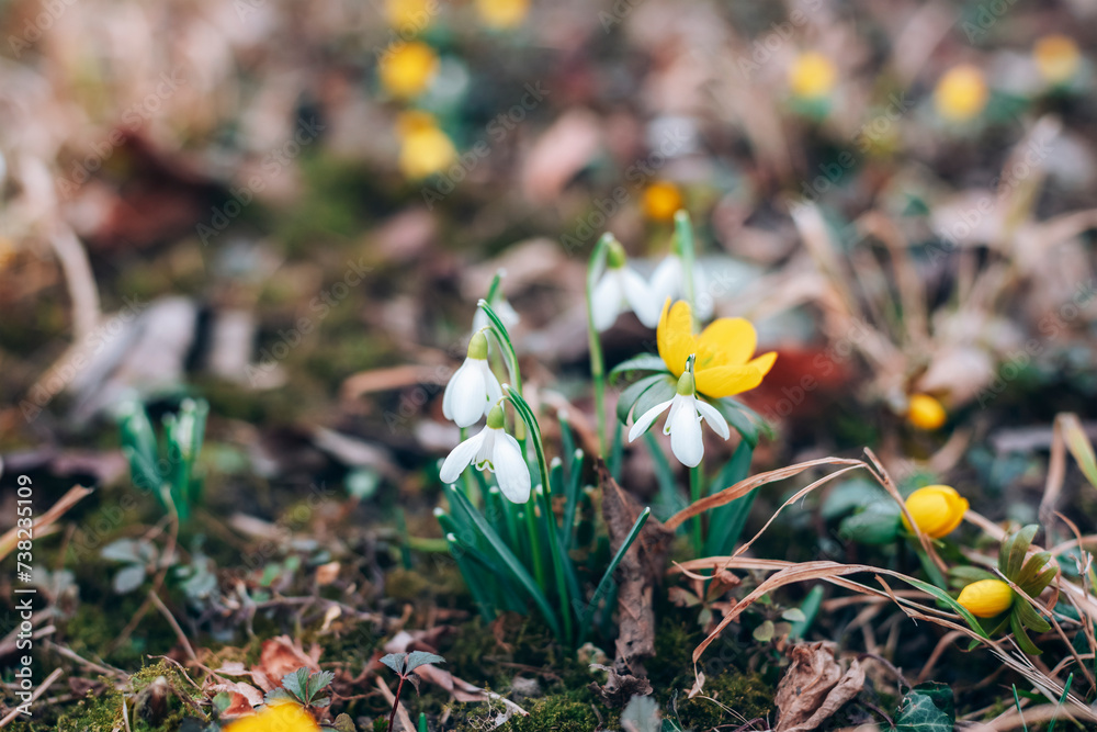 Snowdrops and yellow flowers growing in a forest. Spring flowers. Selective focus
