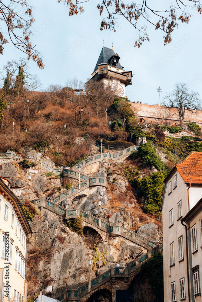 Staircase at Grazer Uhturm Clock Tower on Schlossberg Castle hill. Old city of Graz in Austria. Town in Styria, Europe