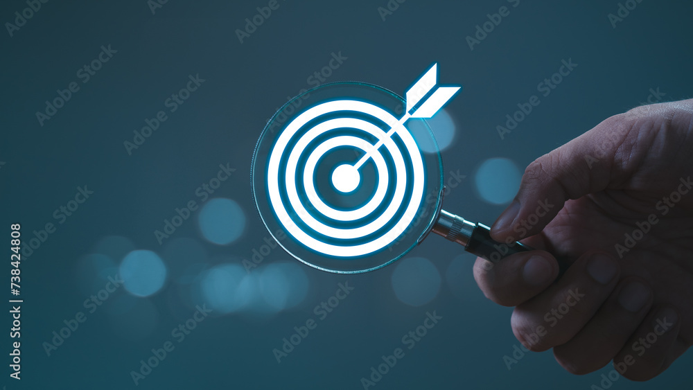 Hand holding magnifier glass with white dartboard with arrow for setup and focus in objective focus target goal concept.