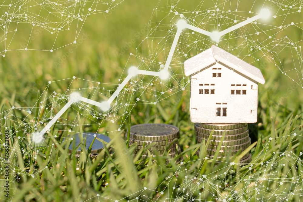 House with stacks of money and an upward curve symbolizing rising real estate prices