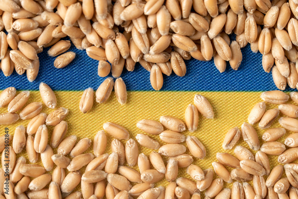 Wheat grains on the yellow and blue flag of Ukraine, Ukrainian grain crisis, global hunger crisis concept