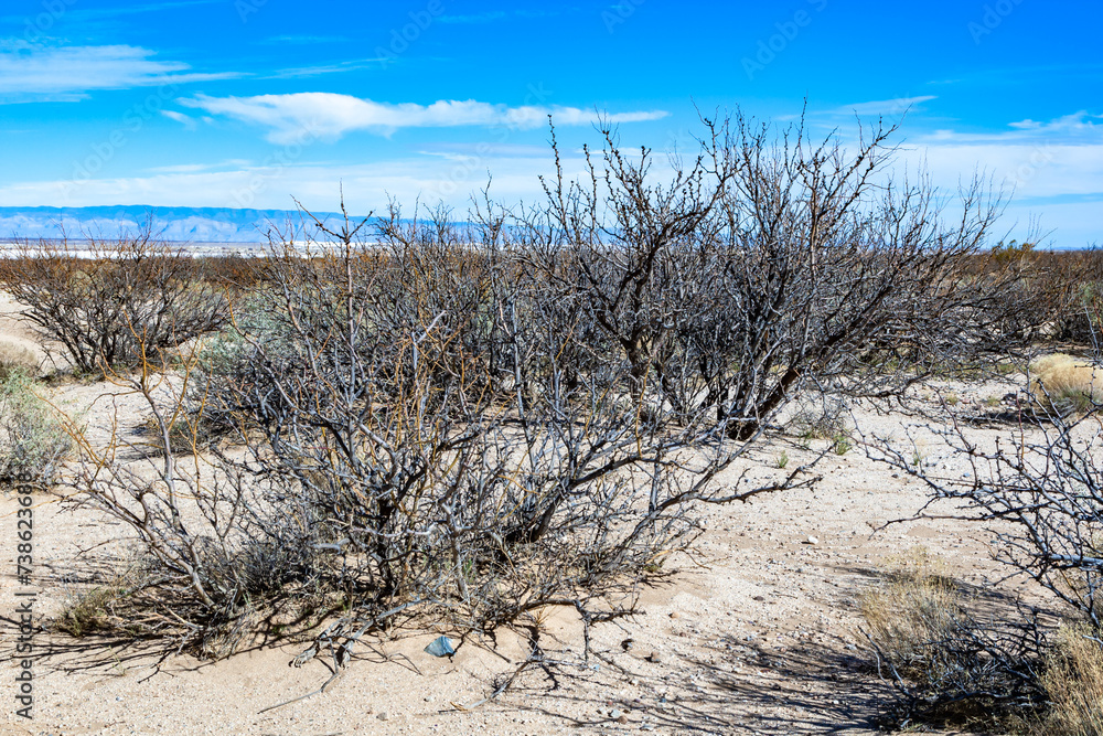 Yuccas and drought-resistant desert vegetation on white gypsum sands in White sands National Monument, New Mexico