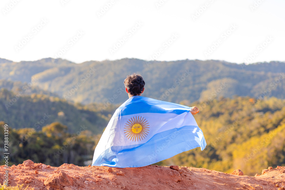 Argentinian man seated atop a mountain, proudly holding the Argentine flag, surrounded by a mountainous landscape. Celebrating Argentina's Independence Day.