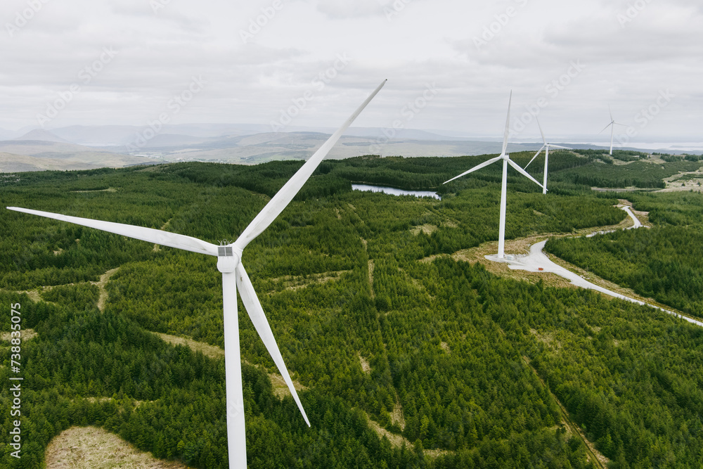 Connemara aerial landscape with wind turbines of Galway Wind Park located in Cloosh Valley, County Galway. Largest onshore wind farm in Ireland. Galway Wind Way recreation.