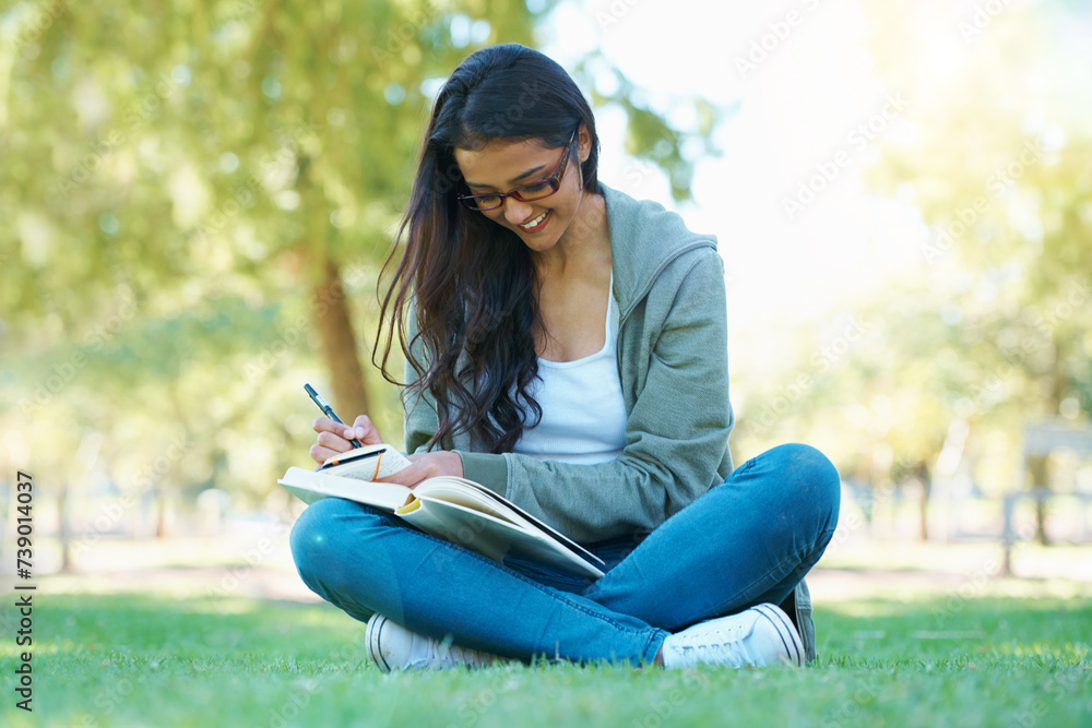 Writing, grass or happy woman in nature with notes for learning knowledge, information or education. Smile, diary journal or student in park for studying idea or peace on college campus lawn to relax