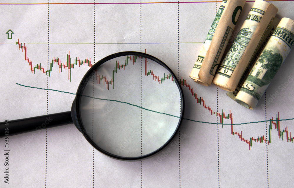 Magnifying glass with dollar bills, graph. Financial analysis, audit or accounting