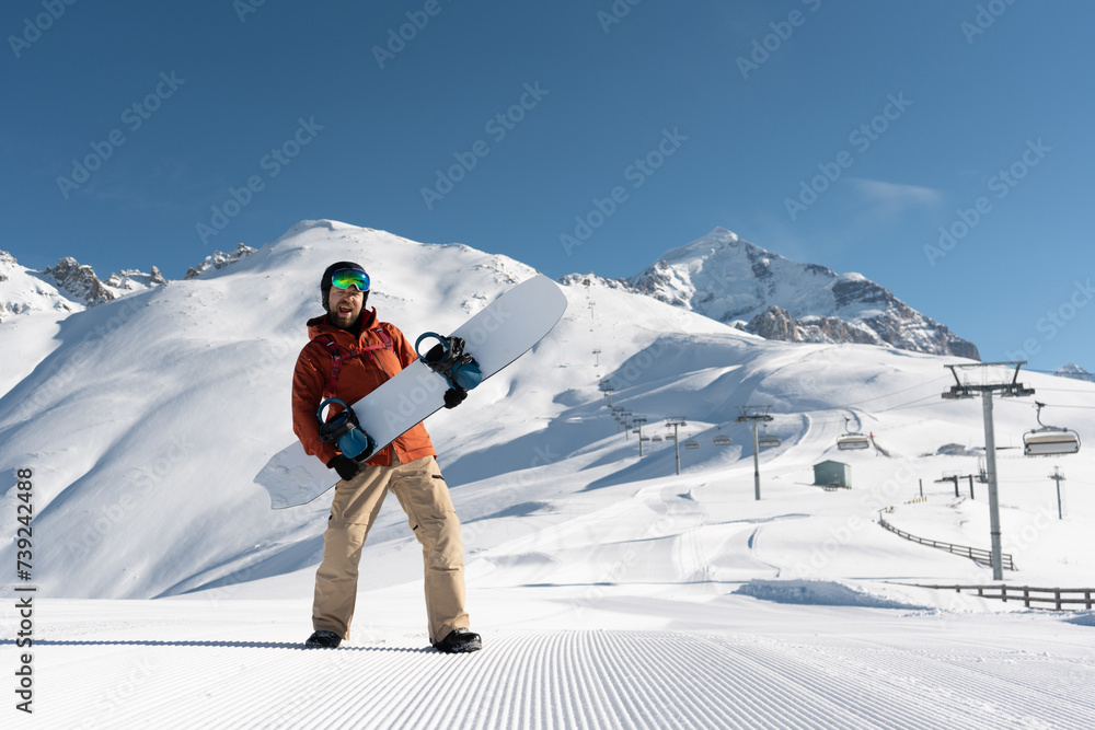 snowboarder holding snowboard standing and posing along ski slope at resort prepared by snowcat