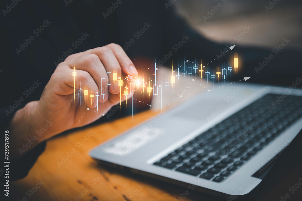 Hand of Businessman or trader is showing a growing virtual hologram stock on smartphone, planning and strategy, Stock market, Business growth, progress or success concept. invest in trading.