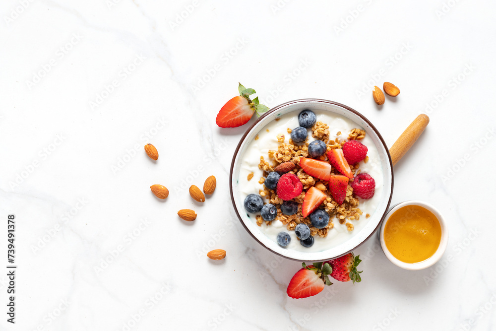 Healthy breakfast bowl with ingredients granola fruits Greek yogurt and berries top view. Weight loss, healthy lifestyle and eating concept