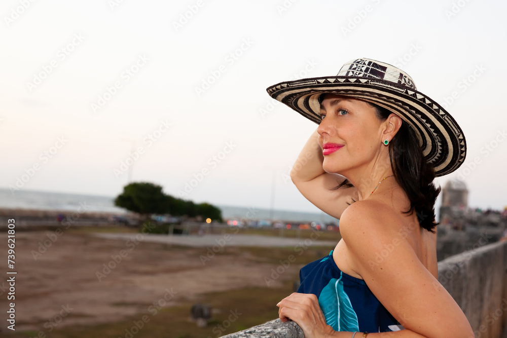 Beautiful woman wearing the traditional Colombian hat called Sombrero Vueltiao at the historical walls of Cartagena de Indias