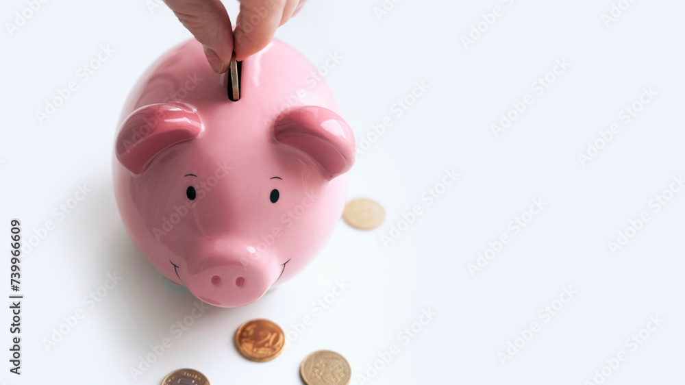 Piggy box, money box on white empty space background horizontal design. Hand insert coins, money saving.Investment and deposit concept.