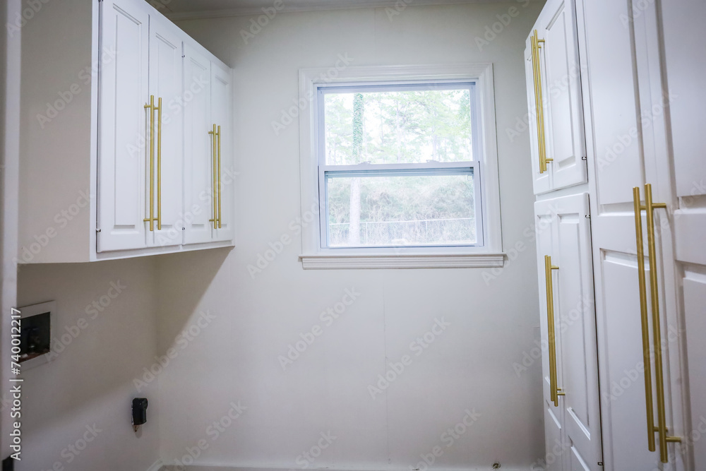 Updated white shaker cabinets with elegant gold sleek thin hardware in a newly renovated laundry room with hardwood floors