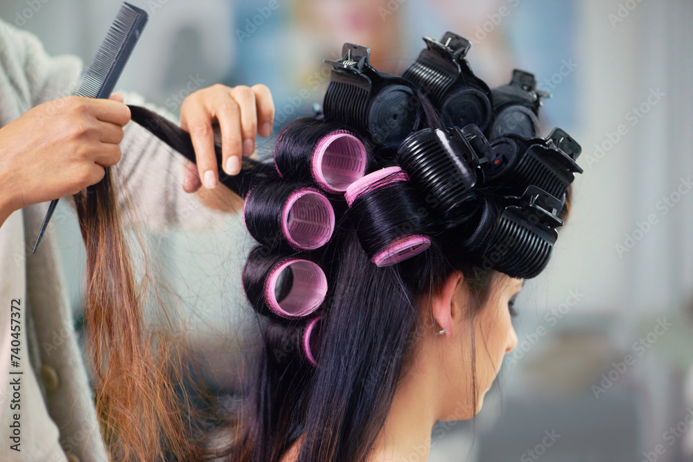 Woman, hair care and makeup with curlers and hands of stylist, cosmetic care and beautician with treatment. Beauty in salon, actor or celebrity backstage with hairdresser and styling for glamour