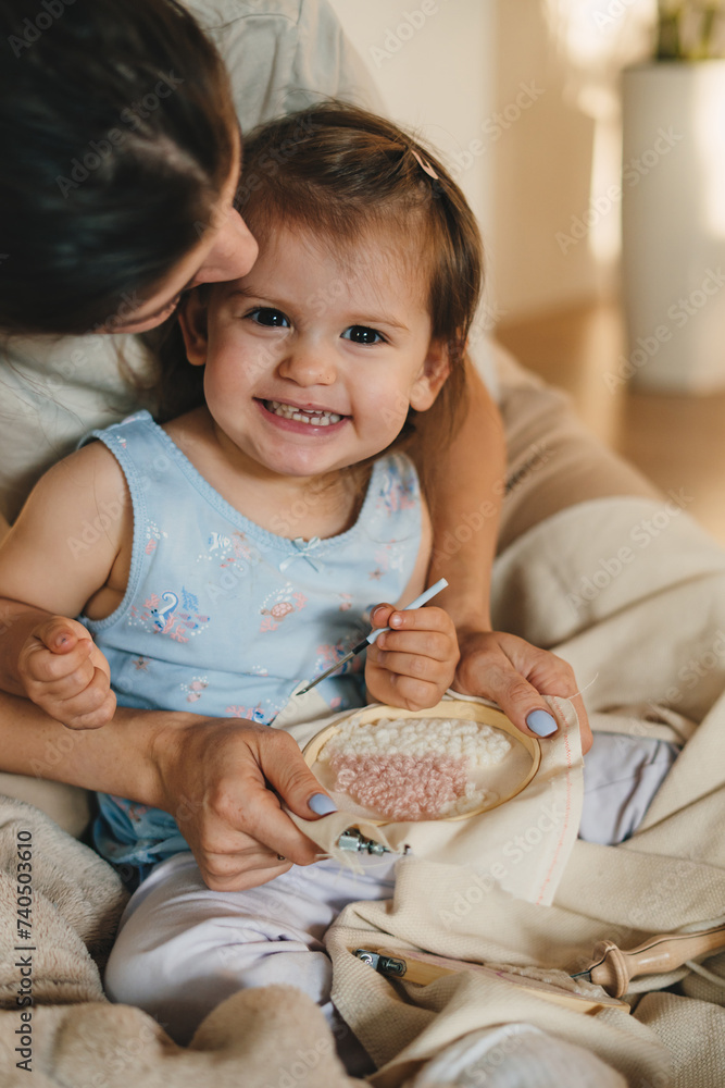 Young woman with her little daughter embroidery yarn with punch needle for craft handmade in hobby lifestyle.