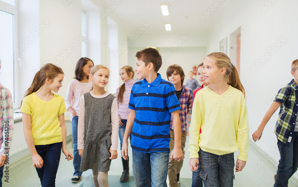 group of smiling school kids walking in corridor