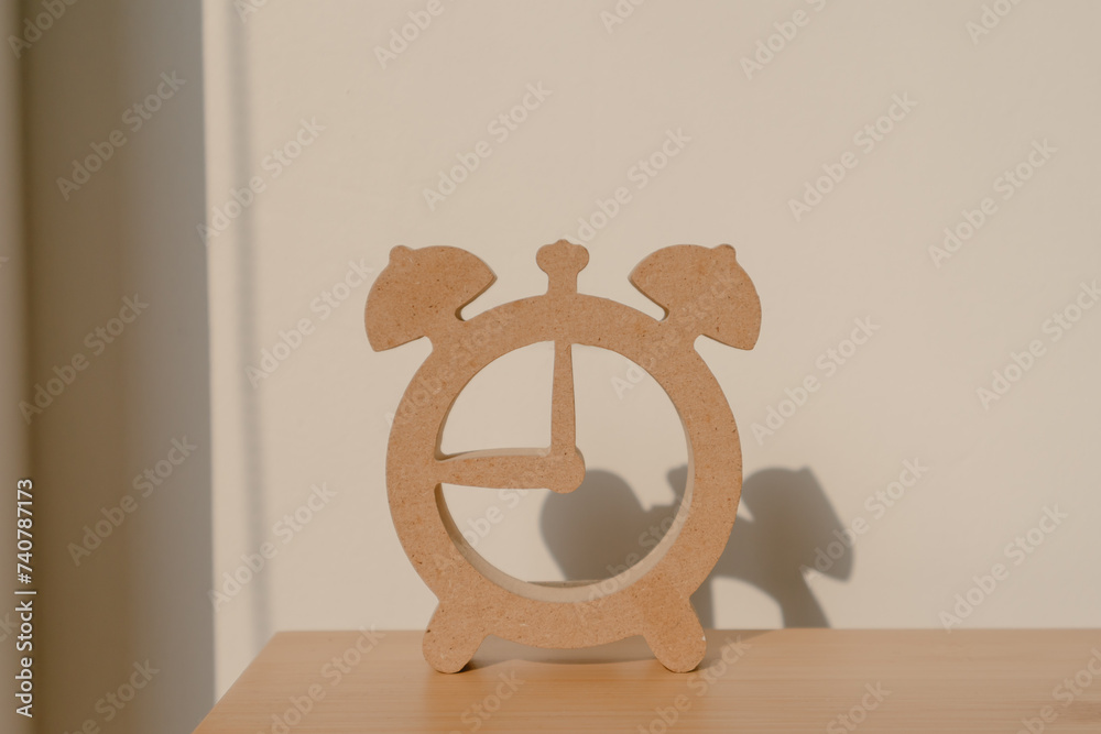 Photo of wooden clock shape design, showing watch model shadow, putting on wood chair with sunlight in room.
