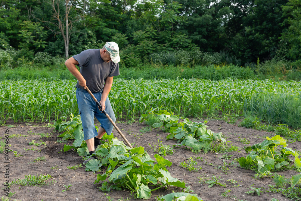 Senior man remove weeds from the pumpkin bed. Farmer in garden at home. Agriculture concept. Elderly man with a hoe working in an agricultural fields in spring or summer.