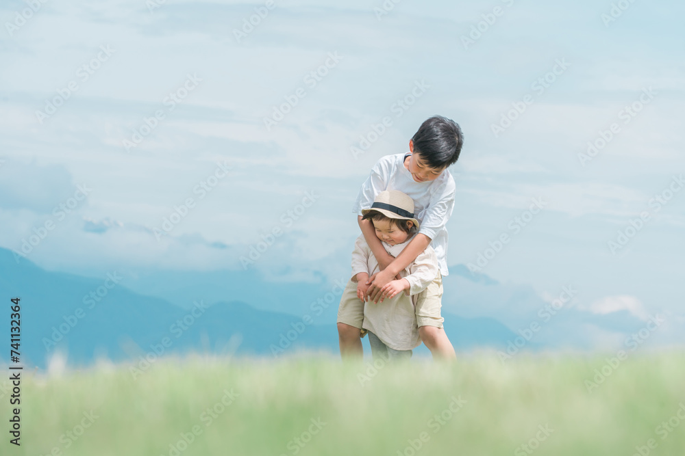 高原・芝生・公園で遊ぶ子供・兄妹(ピクニック・キャンプ・アウトドア)