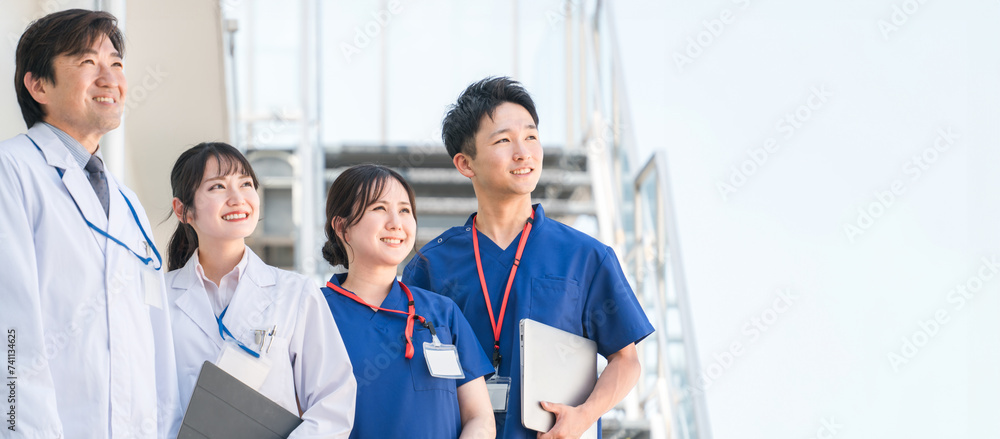 病院の屋上で休憩時間を過ごす男女の医師・医者・看護師・医療従事者・技師(4人)