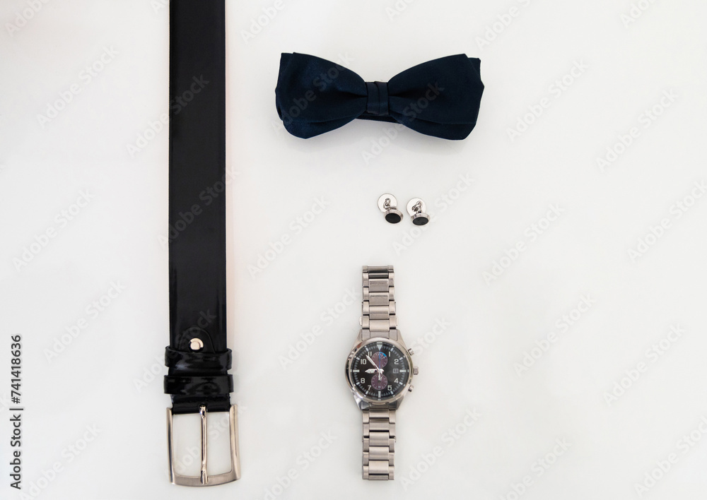 Set maschile per evento. Orologio, papillon, cintura e gemelli.