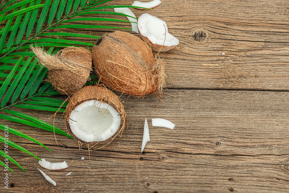 Summer tropical background with coconuts and palm leaves. Traditional decor, textured fruit, voyage