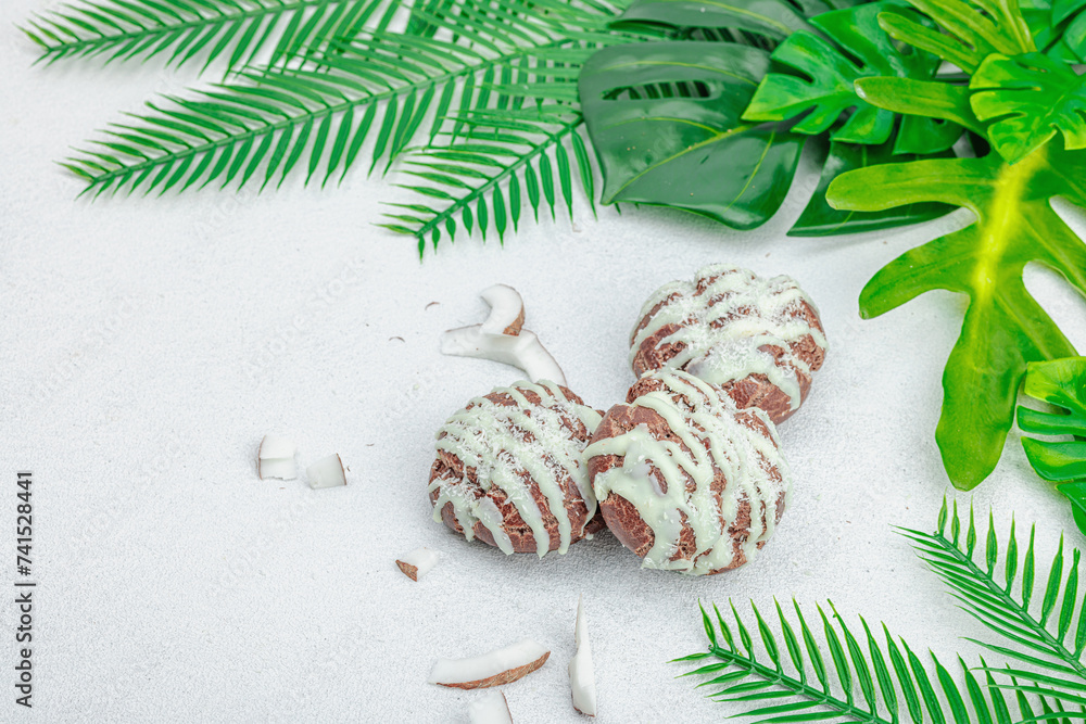 Profiteroles choux pastry buns with coconut cream served in tropical style. Palm leaves