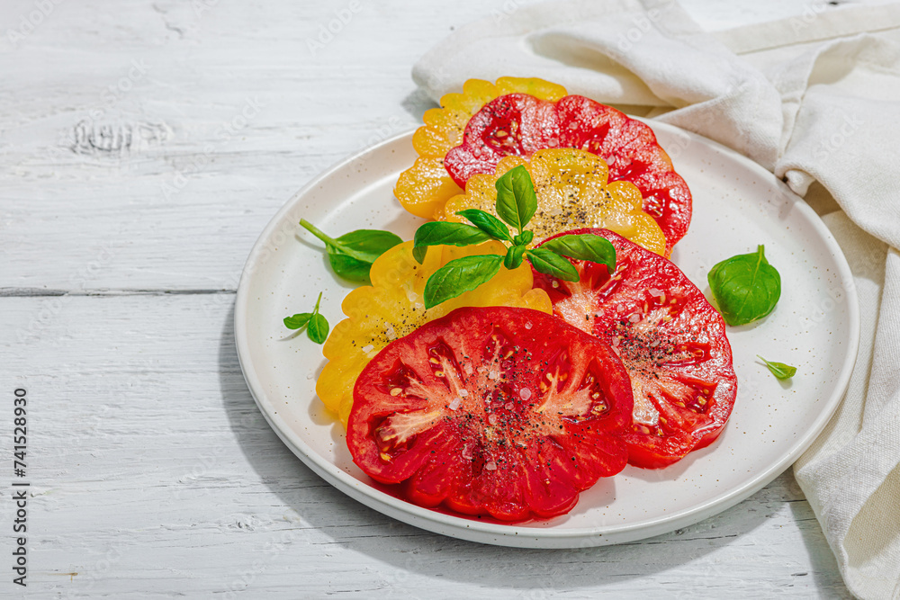 Colorful Heirloom tomato harvest. Ripe ribbed vegetables with fresh basil leaves. Wooden background