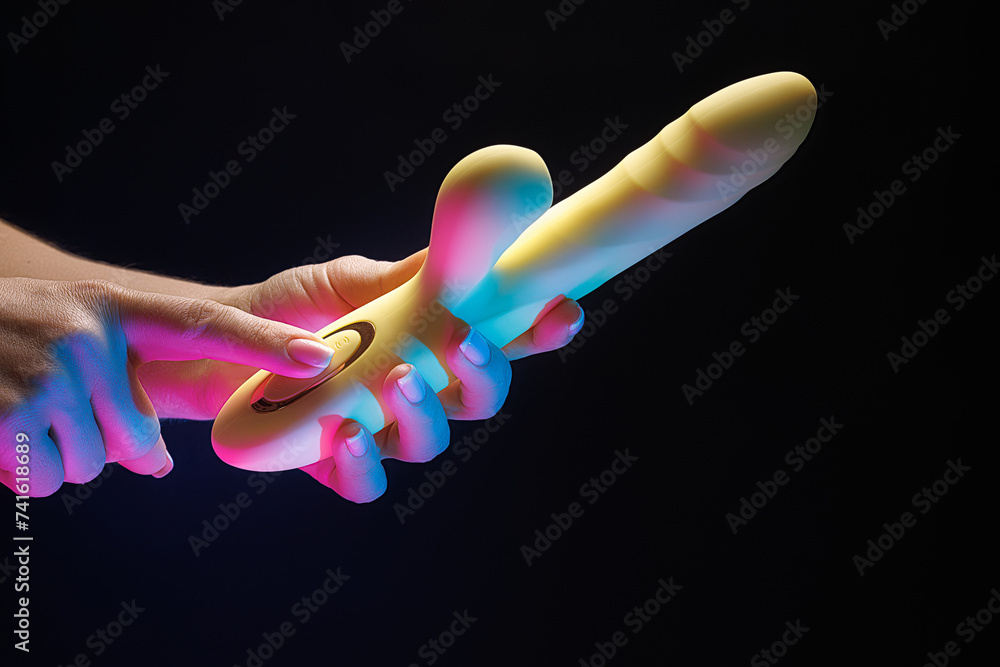 Female hands sex toy dual purpose vibrator girl tries to turn it on by pushing a button. Sex toy clitoral vibrator on a black background with neon lights.