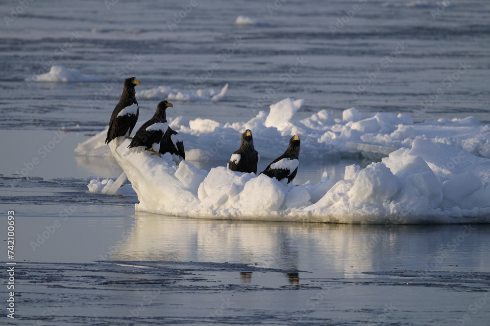 Hokkaido, Japan - February 19, 2024: Steller's sea eagles on drift ice near Rausu Fishing Port in Hokkaido, Japan