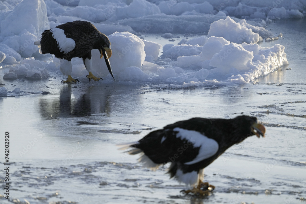 Hokkaido, Japan - February 19, 2024: Steller's sea eagles on drift ice near Rausu Fishing Port in Hokkaido, Japan