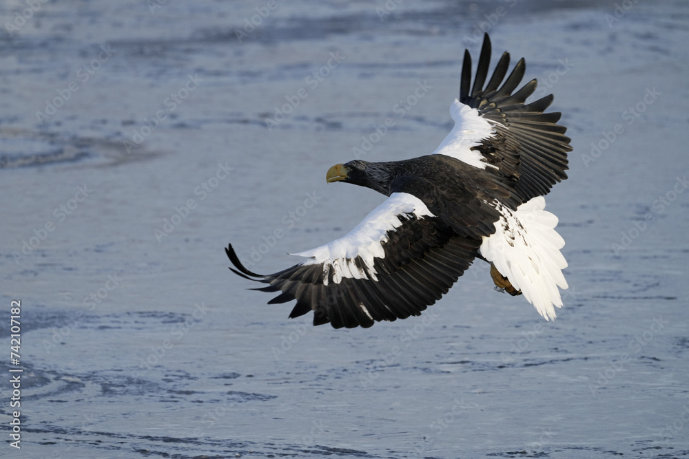 Hokkaido, Japan - February 19, 2024: Steller's sea eagles on drift ice near Rausu Fishing Port in Hokkaido, Japan