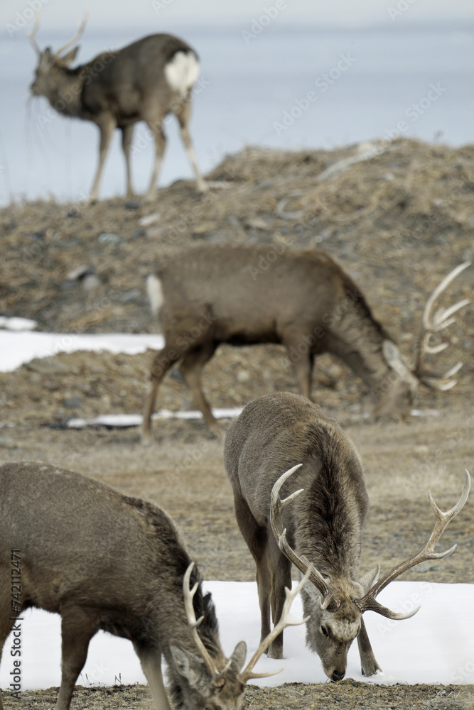 Hokkaido, Japan - February 19, 2024: Herd of Hokkaido Sika Deer or Ezoshika at Notsuke Peninsula in Hokkaido, Japan